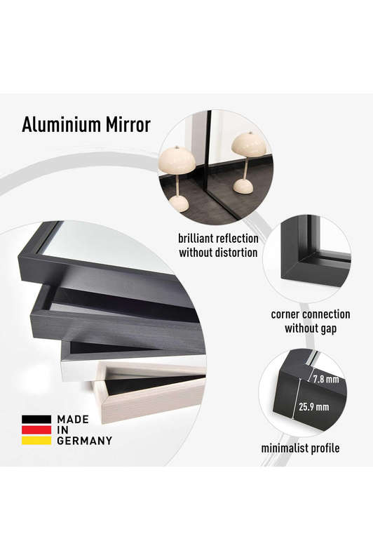 The rectangular mirror features 3 mm copper-free glass produced to DIN EN 1036 standards, ensuring high corrosion resistance and long-lasting, timeless aesthetics. Supplied with a complete mounting set including instructions, hangers, screws, dowels and foam pads for wall protection (fixings to be selected according to wall type), the Alpha mirror can be wall-mounted or freestanding to instantly elevate your space.