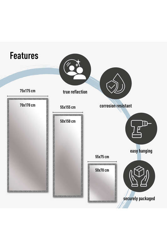Available in external sizes of 51×71 cm, 51×151 cm and 71×171 cm with a slim 2 cm profile depth, the mirror features 3 mm copper-free glass manufactured to DIN EN 1036 standards, offering excellent corrosion resistance and long-lasting visual clarity. Supplied with a complete mounting kit including instructions, hangers, screws, dowels and foam pads for wall protection (fixings to be chosen according to wall type), the Florentina mirror can be wall-mounted or positioned upright to bring a stylish touch of glamour to your space in just minutes.